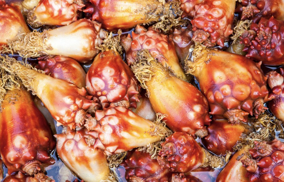 : 지방질이 거의 없어 해삼, 해파리와 함께 '3대 저칼로리 수산물’로 꼽힙니다. 상큼하고 시원한 맛이 일품인 멍게는 붉은색의 단단한 몸에 원추형의 돌기가 많이 나와 있어서 ‘바다의 파인애플’이라고도 불립니다. 글리코겐의 함량이 많아서 수온이 높은 여름철에 맛이 좋으며, 초고추장에 찍어 먹거나 멍게비빔밥, 멍게회덮밥으로 먹습니다.